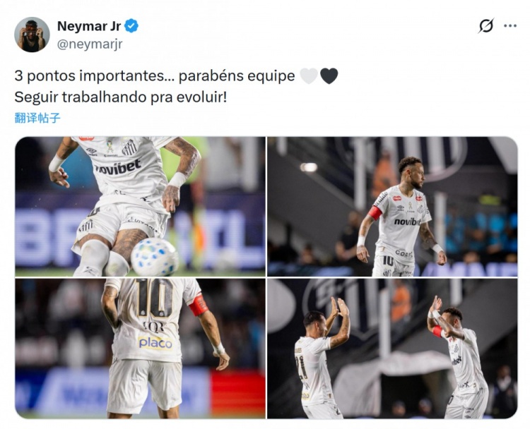 内马尔在社交媒体上晒出比赛照片,配文:“拿下重要三分,恭喜全队。继续努力,不断进步!”