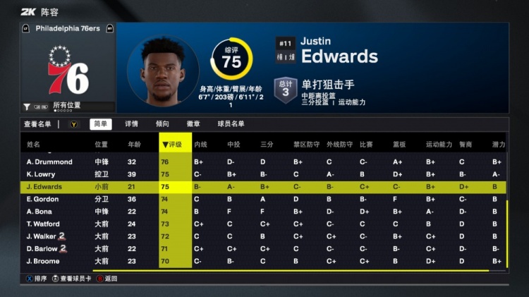 8月30日讯 NBA2K26各队球员能力值出炉,其中76人球员详情能力值如下: